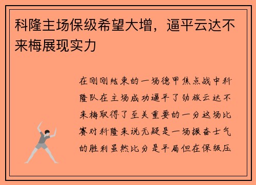 科隆主场保级希望大增,逼平云达不来梅展现实力