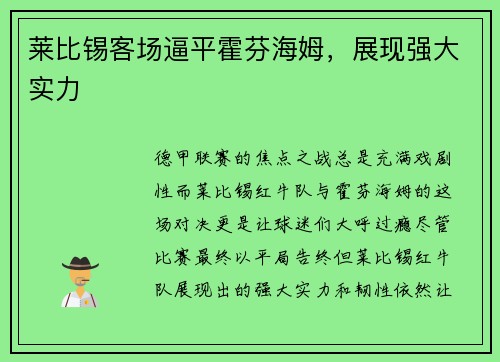 莱比锡客场逼平霍芬海姆,展现强大实力